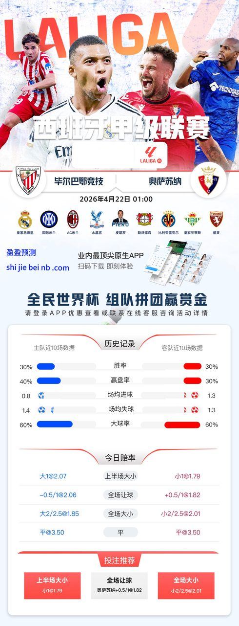 1:00 西甲 🇪🇸毕尔巴鄂竞技 vs 🇪🇸奥萨苏纳